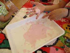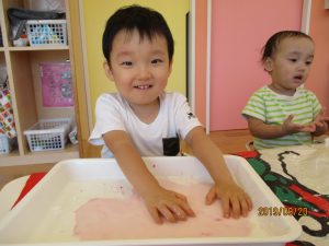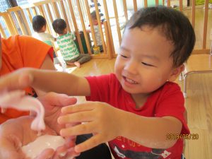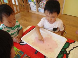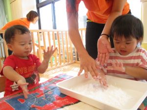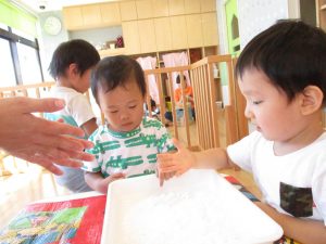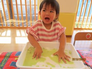固まった片栗粉の感触を喜ぶ子もいれば、ちょっと苦手な様子な子もいましたが、感触遊びを楽しむことができました