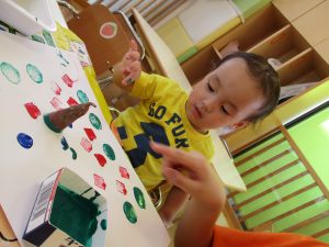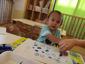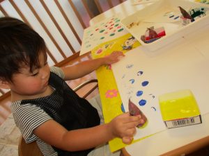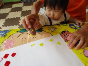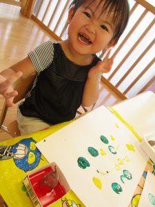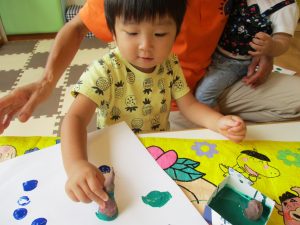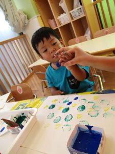 いつものスタンプとは違って少し持ち方に戸惑う子もいましたが、白い画用紙にお芋で色がつくのを楽しんでいましたよ![]()