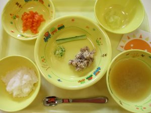 粥 味噌汁 煮魚 スティックきゅうり りんごすりおろし