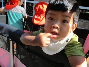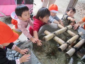 神社の手水舎では水に興味津々でした