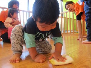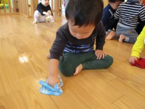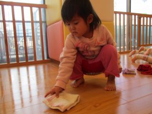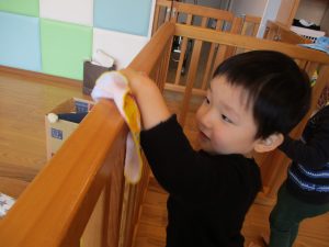 1人1枚ずつ雑巾を持って、とっても上手に床や柵のお掃除をしてくれましたよ