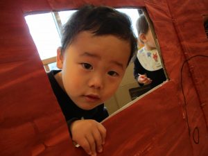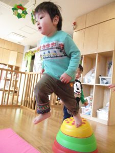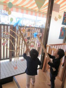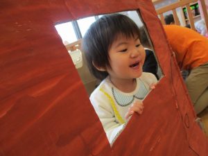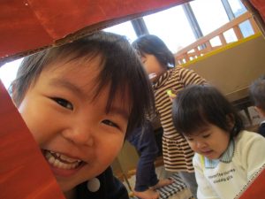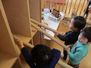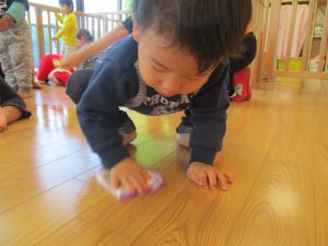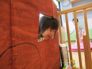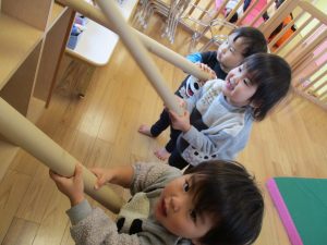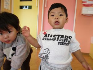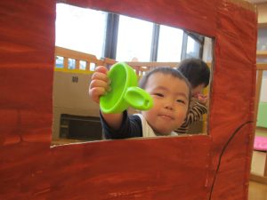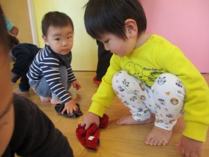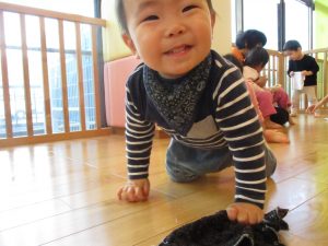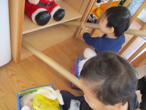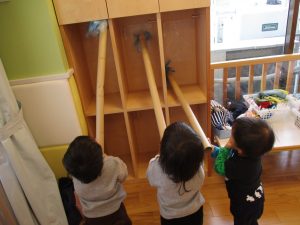 “おそうじごっこ”が楽しかったのか、次の日別の遊びをしていると、子どもたちの方から“おそうじごっこ”に発展していき、保育士が即席のハタキを作ると、みんなで張り切って掃除をしてくれました