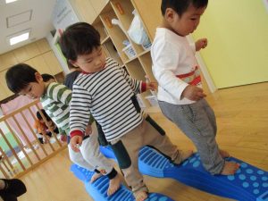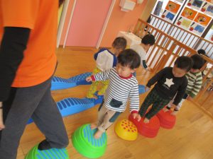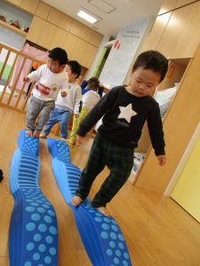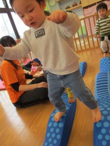 1本をまっすぐ歩いて渡ったり、横歩きで渡ったり、片足ずつ乗せて渡ったりと、色々な姿見られました