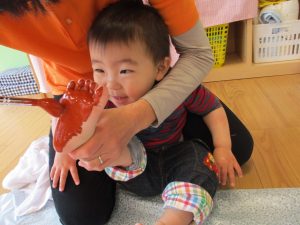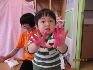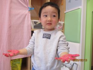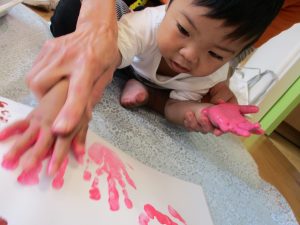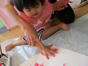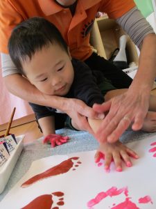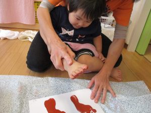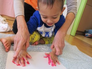 今日は、3月の制作の準備で子どもたちの手形・足形をとりました