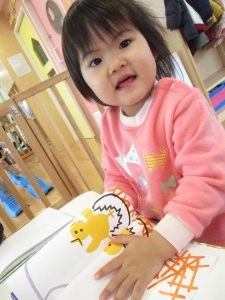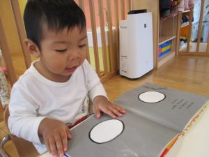 隣の部屋では、机と椅子を並べて絵本や手先を使った遊びを楽しんでいました