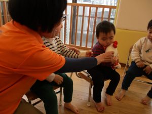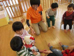 ぬいぐるみを持って歌に合わせて隣へと、、、。