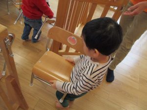 保育士が椅子を円形に並べると自分の椅子を探して座りに行く子どもたち。