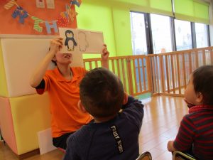 無色の動物の絵に色がついていくマジックでしたが、不思議そうに見入ったり、面白そうにリアクションをしてくれたりと楽しんでいましたよ![]()