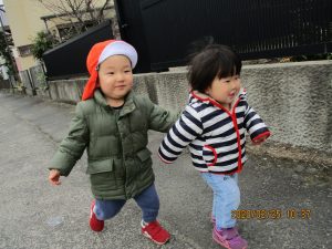2歳児さんが0歳児さんを気遣って背中を支えてくれたり、歩くペースを合わせてくれたりすることも![]()