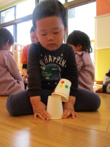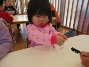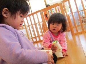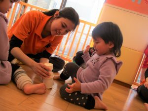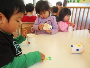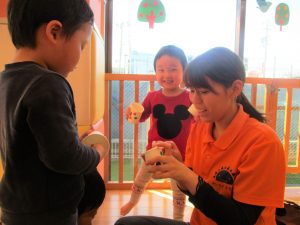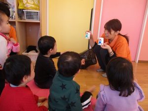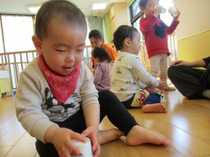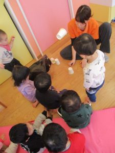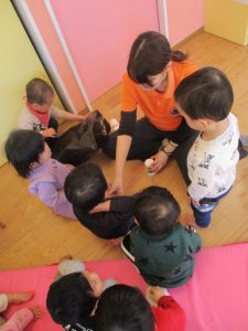保育士が袋を持ってくると、興味津々で集まってくる子どもたち![]()