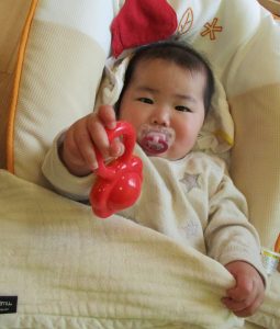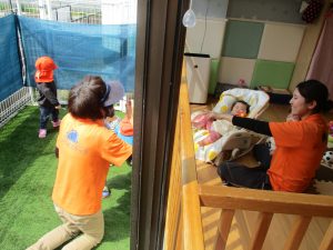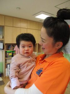 0歳児さんも、保育者に抱かれて泣けちゃうけど、“この人は誰?”と時々確認するそぶりを見せ、時折笑顔も見せてくれていました![]()