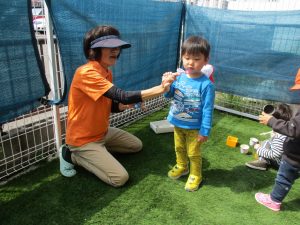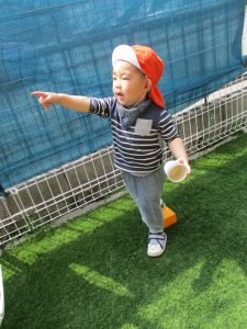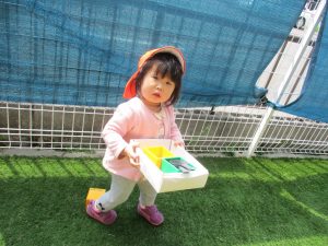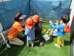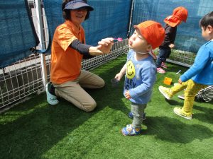 天気も良く気持ちのいい陽気だったので、1・2歳児さんは園庭に出て遊びました![]()