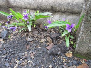 アスファルトの隙間からスミレが咲いているのを発見![]()