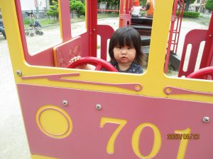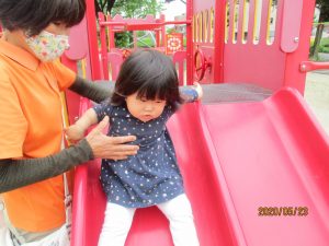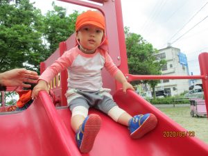 初めて行く公園の滑り台で少し緊張ぎみかな