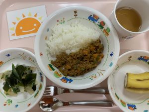 ※今日は、キーマカレー。やはりカレーは人気ですね♪おかわりもたくさんしてくれました!!大根サラダは、さっぱりとした甘酢の味で、苦手な子も多かった様ですが、頑張って食べていました。