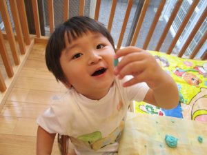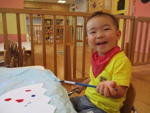 保育者や保育園生活にも少しずつ慣れてきて、笑顔をたくさん見せてくれるようになったもも組さん?