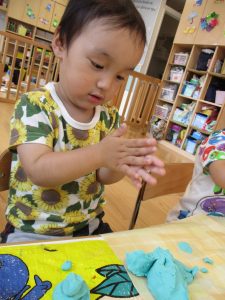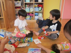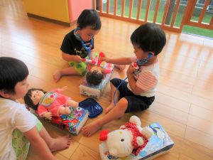 お医者さんごっこをすると、患者さんのぬいぐるみに聴診器を当てたり、注射をしたり、薬を飲ませてあげたりと本物のお医者様も顔負けの治療をしていましたよ![]()