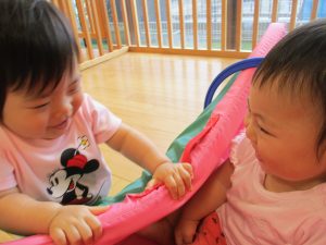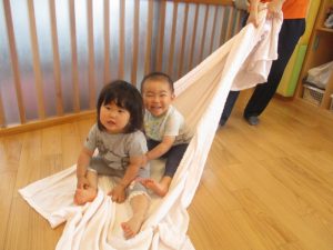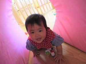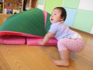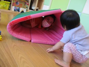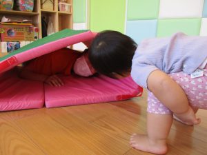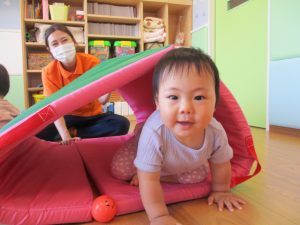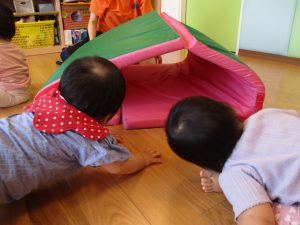 0歳児さんの部屋でマットを出してトンネルをつくると、上手にくぐってきて・・