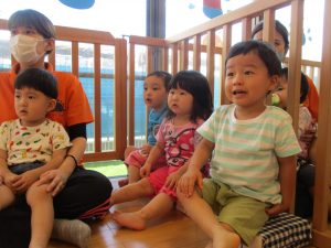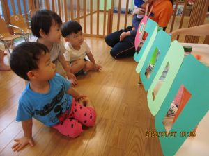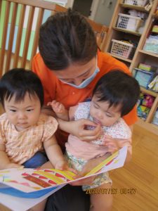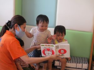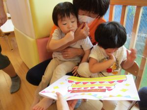 まだみんなと一緒の時間はじっと絵本が見れない0歳児さんは、クラスでも絵本を楽しんでいましたよ![]()