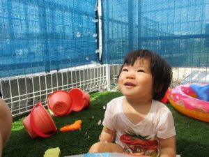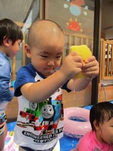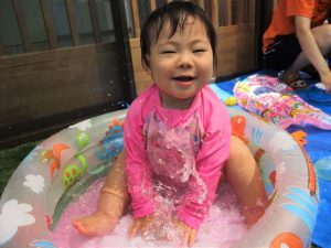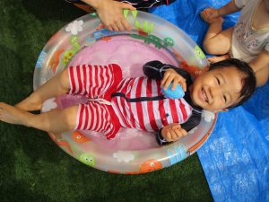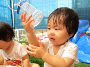 水あそびが始まった頃は泣けることもあった0歳児さんも、このとおり