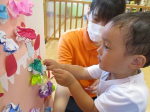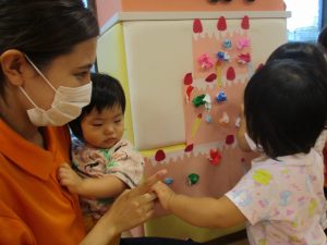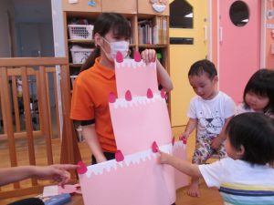 お誕生日のお友だちの紹介後、みんなでケーキを作りました![]()