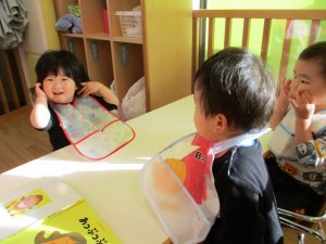 保育園でも、子どもたちがおもしろい顔をしてくれたり、保育士の顔を見てわらったりと、みんなで一緒に楽しめる絵本です