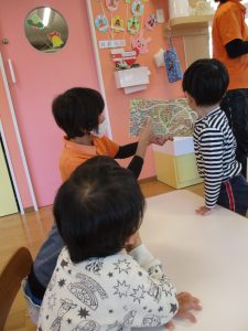色々な国の迷路が出てきて、子どもたちもどこを通ればいいのか興味津々でのぞき込んでいましたよ![]()