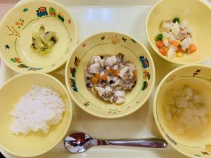 粥 味噌汁 麻婆豆腐風 ツナとじゃが芋煮 にんじんの甘煮