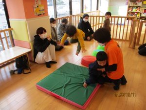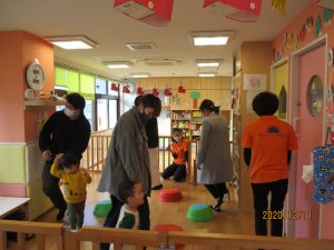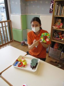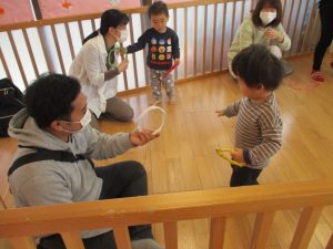 “はたらくくるま”では、輪投げの輪をハンドルに見立てる為、保護者の方の分もちゃんと渡しに行ってくれていました![]()