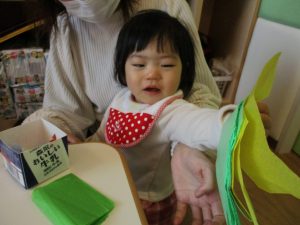 お母さんと一緒に花紙をくしゃっと丸めてリースに貼ったり、ポンポンやサンタさんなどの飾りを貼ったりとかわいらしいリースを作りました![]()