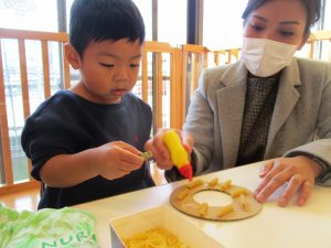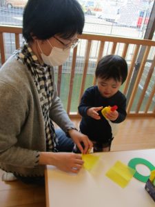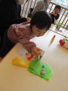 お父さん、お母さんと一緒にボンドを使い、思い思いにくっつけていましたよ![]()