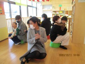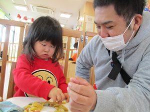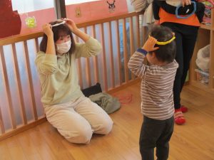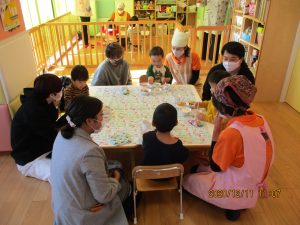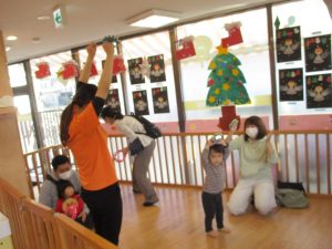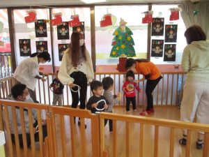 時間差で各学年保護者の方に園に来ていただき、普段の様子や、成長したことの披露、クリスマスリースの制作、ふれあい遊びなど、短い時間でしたが、親子で一緒に楽しい時間を過ごしていただきました?