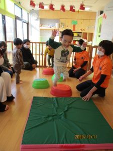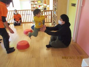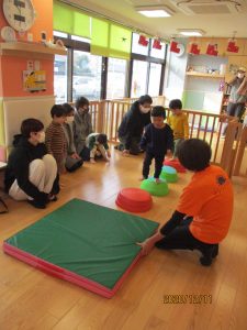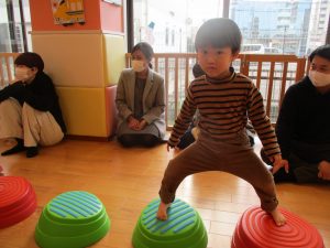 2歳児さんは、巧技台を使った体の動きを見て頂きました![]()