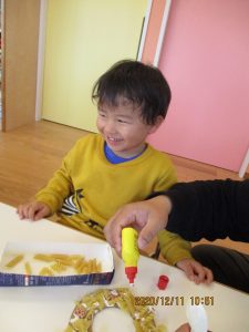 マカロニ1つひとつにボンドをつけてはりつけていく子や、好きなマカロニの形を選んでお母さんに渡していく子など、親子で一緒にかわいいリースを完成させました![]()