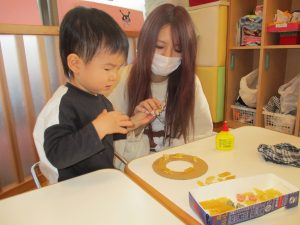 おやつの後は親子で一緒にリースの制作を行いました![]()