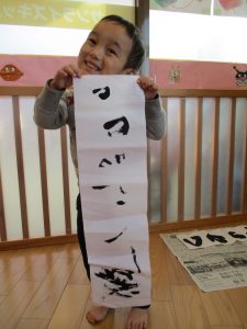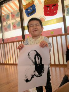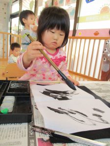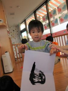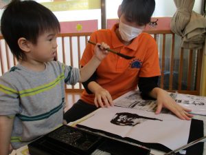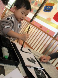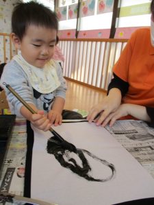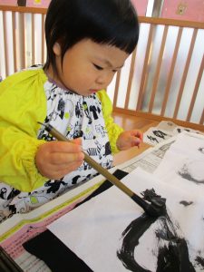 0歳児さんは初めての経験ですが、硯の墨(黒色絵の具)を自分から筆につけたり、筆さばきもスムーズだったりして保育士も驚きでした