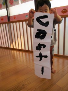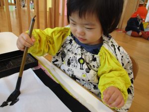 書き初めは去年も行っている為、経験のある2歳児さんは慣れたもの