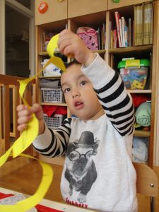 先週2歳児さんが画用紙を螺旋状に切って、手作り凧を作りました