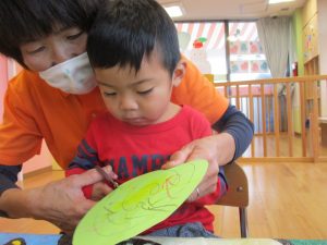 去年は保育士と一緒に書いたり、初めて経験をする1歳児さんも、2歳児さんの様子を見て、上手に自分で書くことができました
