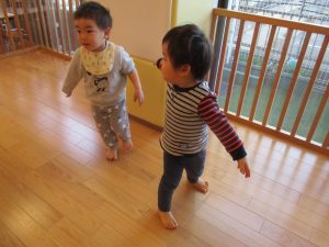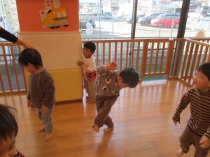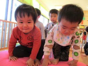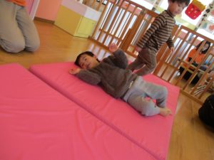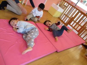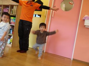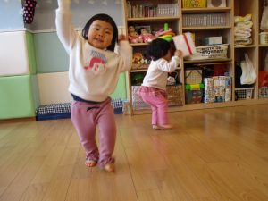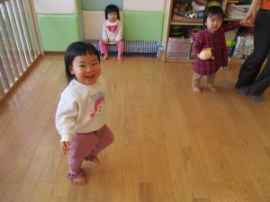 保育士の真似をしながらキーボードに合わせて軽やかに走ったり、跳ねたり(ジャンプ)、ゴロゴロと転がって楽しんでいます。