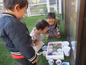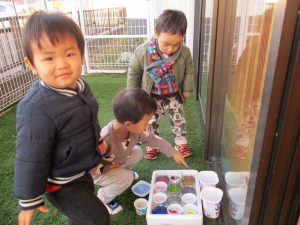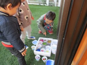 そんな中、火曜日の午後りんご組さんがちぎってくれた色紙、毛糸を入れた水や色をつけた水のカップが園庭に並びましたよ。