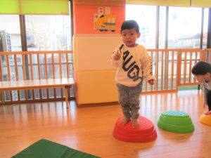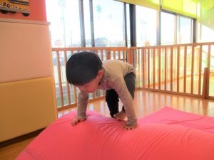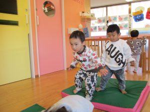 体操では巧技台やマットを使いよじ登ったりジャンプしたり、バランスよく歩くことで平衡感覚の発達へとつなげていけるように取り組んでいます。