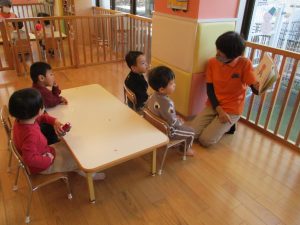 かわいいおにの子たちのやりとりに興味津々な子どもたち![]()