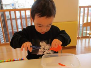 2歳児さんは、具材をハサミで切ることからスタート![]()