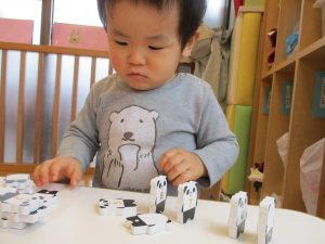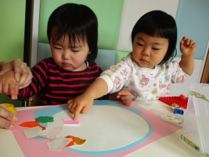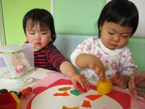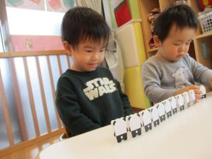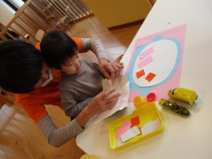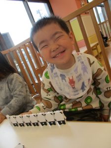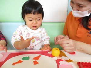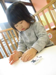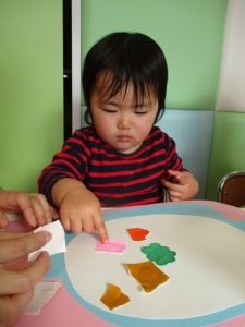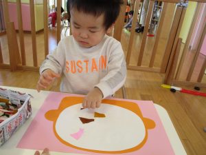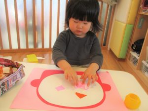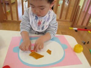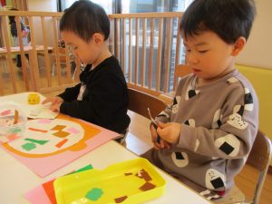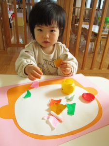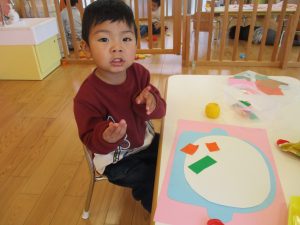 1歳児さんはのりの感触や使い方にも慣れ、1人で上手に具材をお鍋に貼っていました![]()