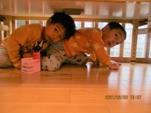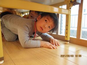 と保育士が豆を投げても、かなわないと思ったのか、机の下に隠れに行く子も