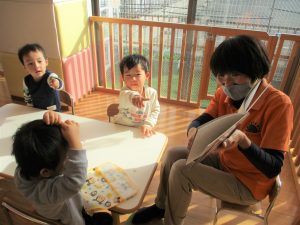 最初に、保育士が絵本を読んで節分のお話をしました