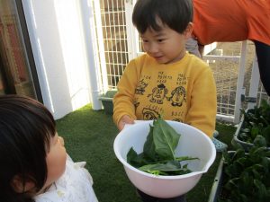 園庭で育てているほうれん草がどんどん葉っぱを増やし、子どもたちと一緒に収穫を楽しんでいます![]()