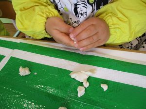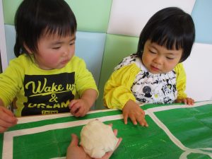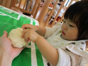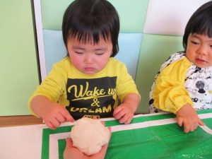 0歳児さんは、小麦粉粘土を楽しみました![]()