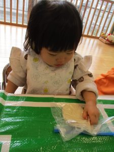 感触の苦手な子には、袋に入れて渡してみると・・